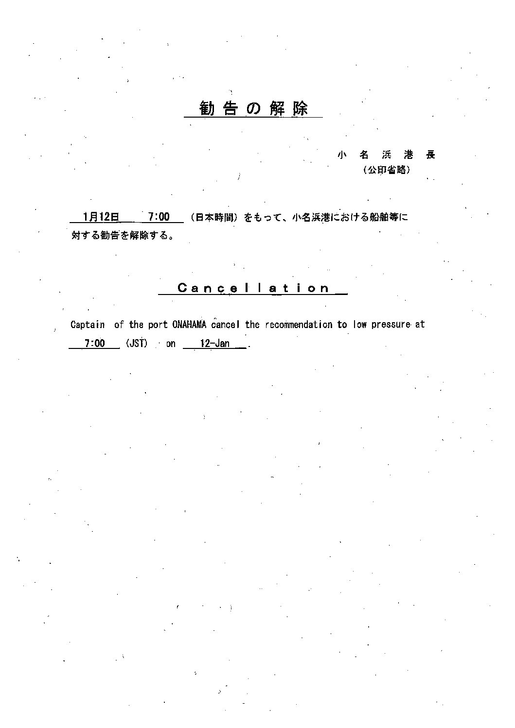 警戒勧告解除のお知らせ