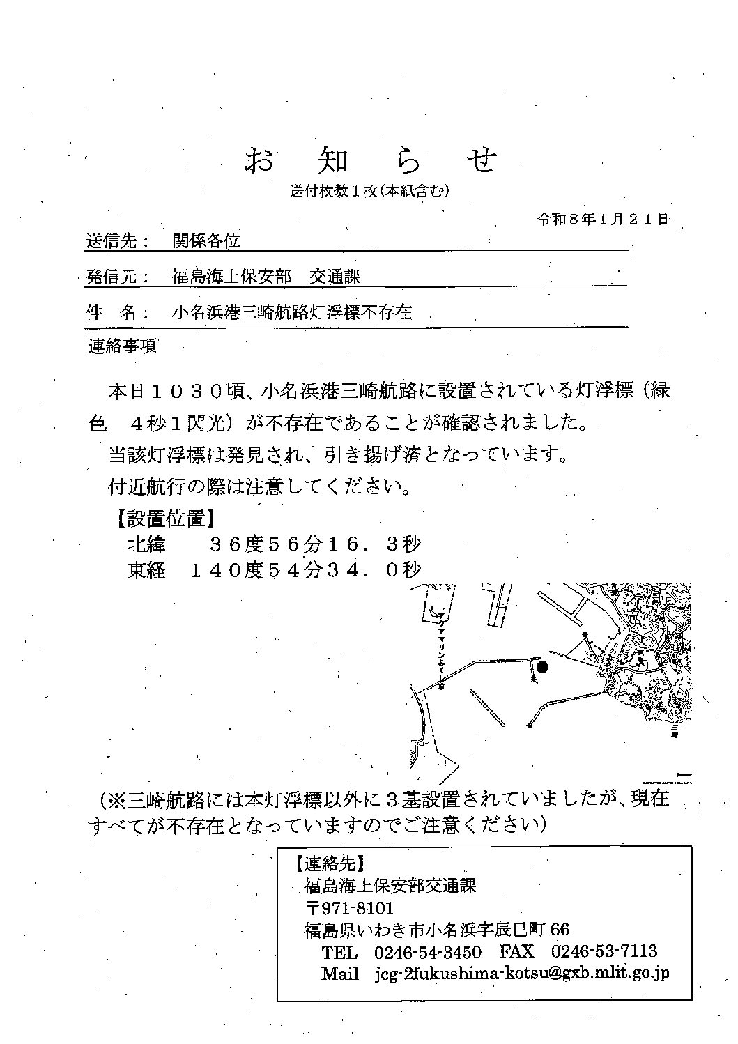 令和8年1月21日(水)海上保安部より灯浮標不存在のお知らせがございます。