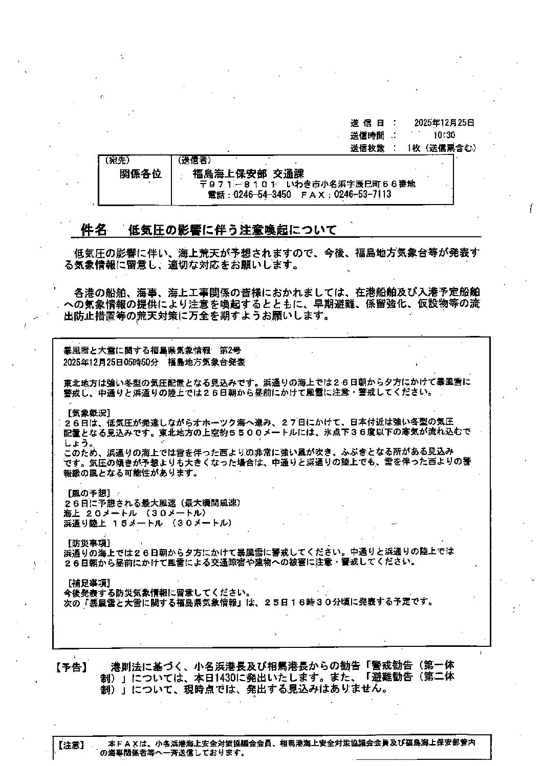 海上保安部よりお知らせ 2025.12.25 お知らせ 低気圧の影響に伴い、海上荒天が予想されております。オーナーの皆様におかれましては、今後の気象情報に留意していただくと共に、荒天対策に万全を期して頂きますようお願い致します。