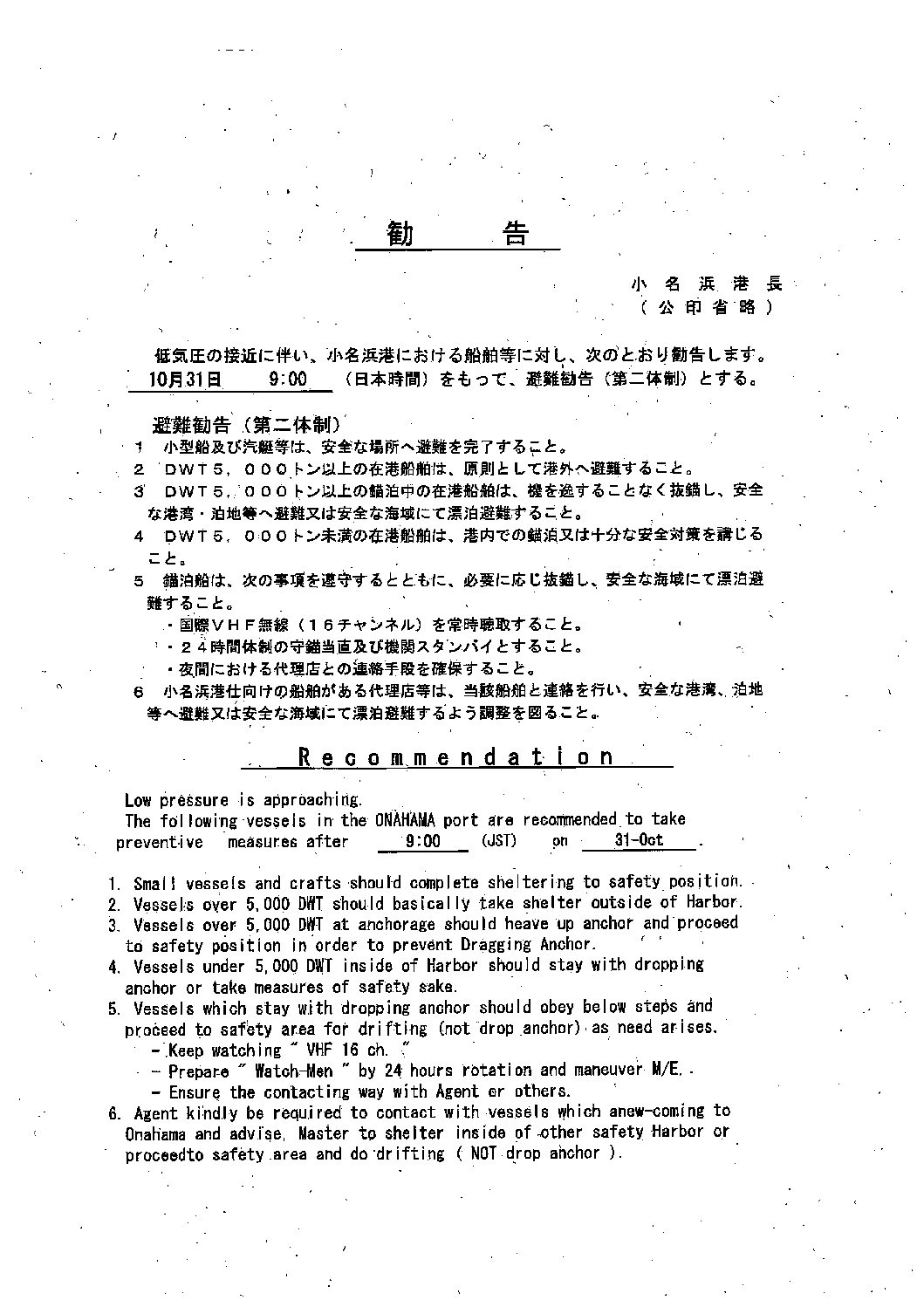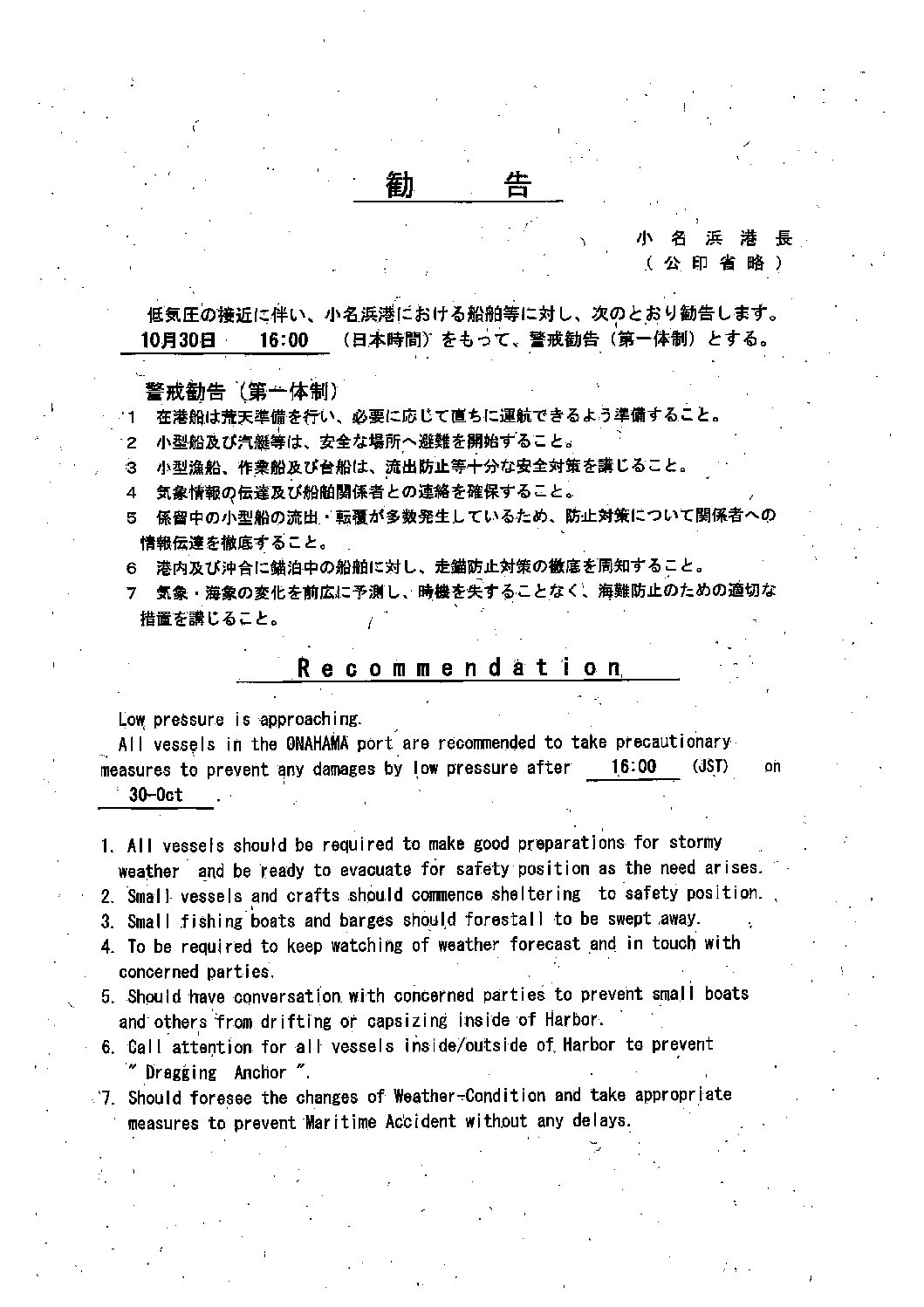 低気圧の接近に伴う警戒勧告のお知ら・・・